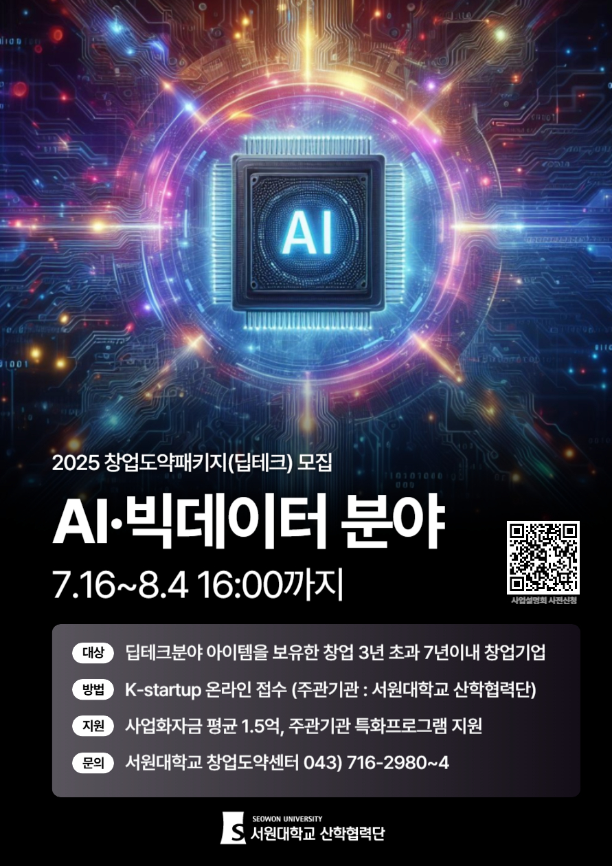- 사업관련 문의 : 서원대학교 창업도약센터 043)716-2980~4자세한 내용은 첨부파일 참조 및 문의처로 문의하여 주시기 바랍니다.